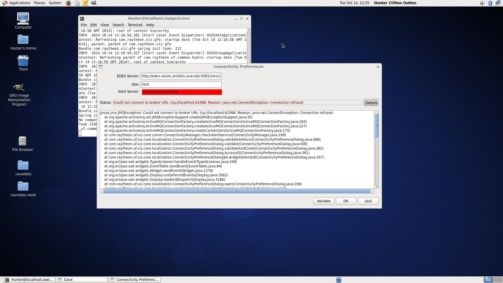 Since i had the updated awips2-cave files, i have been getting error regarding the java net causing AWIPS to crash. Any idea? -- *~Hunter Clifton Outten~* *Pattern Cycle Theory Creator* *Accuweather.com Astronomy * *570-250-4530*