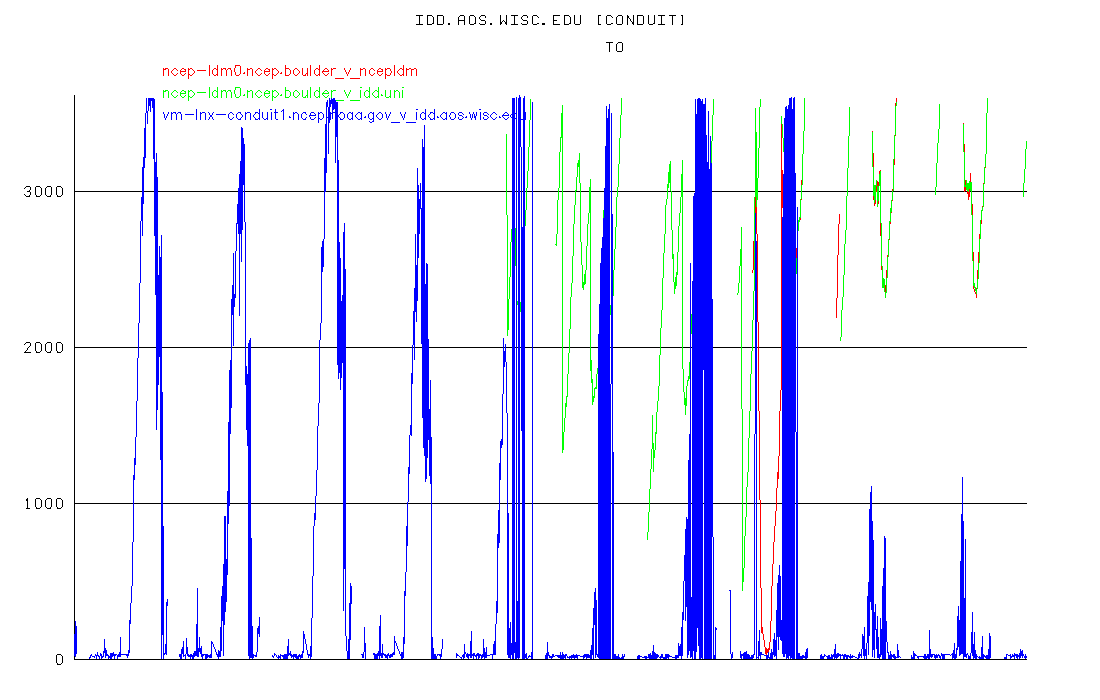 About half-way across the graph, where the peaks begin to be filled in and the green line starts, I added idd.unidata.ucar.edu to the mix. Lags were still large.