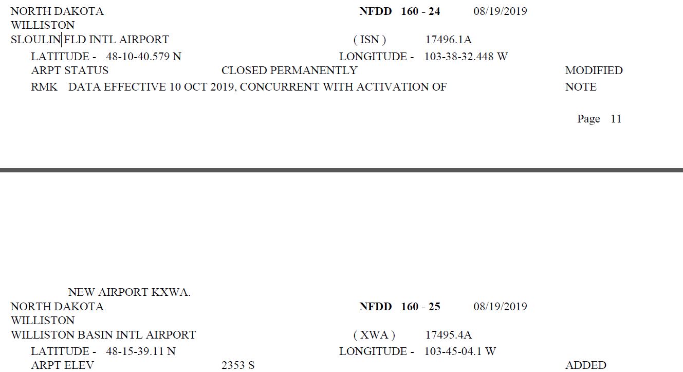 On or about 10/10/2019, a new airport will become operational in Williston ND. The new identifier is KXWA. Once this occurs, the current Williston Airport (KISN) will stop service. The ASOS unit at KISN will be moved to KXWA for METARs and TAF service should begin. There may be a time when we see METARs from both sites as the ASOS is being moved (one will report manually-taken METARs). I believe the IATA code for KXWA will be ISN, as XWA is already used for another location, and with one airport replacing another in the same city, usually the IATA code moves to the new airport. Attached is the info on the change from the Daily NFDD last week. Boris