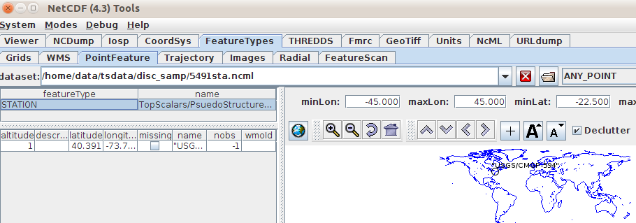 Hi folks-I manage some data that's "grid" by default, but would better be represented in CF as Discrete Sample data. When I open the attached ncml in toolsUI V4.3, I get a generally good result, in that the result is understood as a Point Feature (see Screenshot.png). However, shouldn't the featureType show up as "timeSeries" since that's what's in the ncml featureType attribute? Is the name displayed related to what's part of the Unidata CDM and what's part of CF? I still have trouble distinguishing where one stops and the other starts...