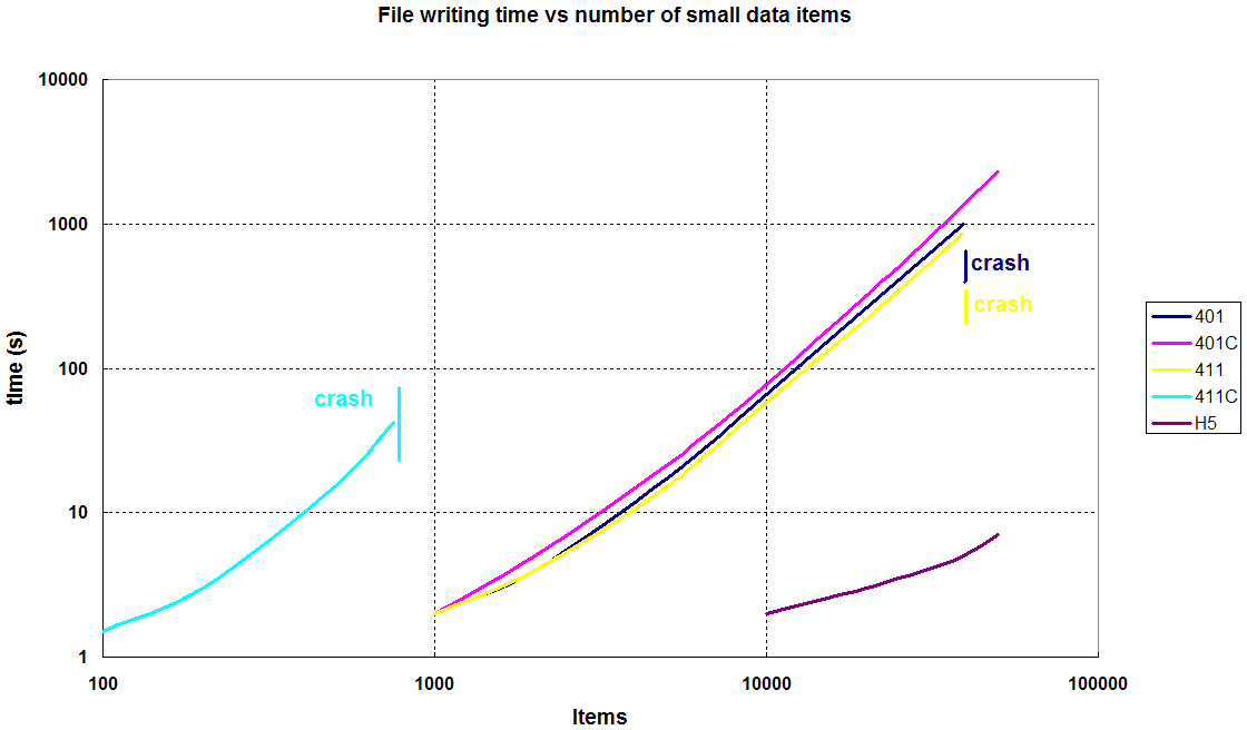 PPS. Sorry, there is a mistake in previous mail. Actually, it crashes at 754 items: the same as in ver 4.1.1. Sergei -----Original Message----- From: Shibaev, Sergei Sent: 08 November 2010 17:10 To: 'netcdfgroup@xxxxxxxxxxxxxxxx' Subject: FW: [netcdfgroup] Netcdf-4.1.1 fault PS. I have tested version 4.1.2beta1. When chunking is on the program crashes at 75 (!) items: it takes > 3 GB memory. So, this is a move in wrong direction. Regards, Sergei -----Original Message----- From: Shibaev, Sergei Sent: 08 November 2010 16:17 To: 'netcdfgroup@xxxxxxxxxxxxxxxx' Subject: FW: [netcdfgroup] Netcdf-4.1.1 fault Hello NetCDF Group, In previous mail I have reported Netcdf-4.1.1 fault. Further investigation shows that this is common NetCDF API problem. I make a simple test program; it writes a requested number of small identical items (1000 ints) into NetCDF file. The items are stored in groups by 10. All items uses the same dummy dimension (may be this is the root of the problem) in the root group. For all testing I use HDF5-1.8.4patch1. The plot attached shows file writing time as a function of number of items. The traces are marked as: 401 - version 4.0.1 without chunking; 401C - with chunking: chunk size = 1000; 411 - version 4.1.1 without chunking; 411C - with chunking. H5 is time of HDF5 file writing; the file contains the same information except dummy dimension: the item size is stored in the item itself. The program crashes with two reasons: "HDF error" or "glibc detect: double free or corruption". The crashes happen when the memory consumption (by "top") exceeds 3 GB. The memory consumption for 10000 items is approximately: 401 - 880 MB; 401C - 295 MB, note: better than 401; 411 - 848 MB; 411C - 40000 MB!!! - extrapolated, it crashes at 754 items. Obviously there is a bug in chunking handling in version 4.1.1. Test with compression gives practically the same result. And there is a limit in NetCDF file complexity, at least for existing API implementation. Regards, Sergei -----Original Message----- From: netcdfgroup-bounces@xxxxxxxxxxxxxxxx [mailto:netcdfgroup-bounces@xxxxxxxxxxxxxxxx] On Behalf Of Shibaev, Sergei Sent: 27 October 2010 14:32 To: netcdfgroup@xxxxxxxxxxxxxxxx Subject: [netcdfgroup] Netcdf-4.1.1 fault Hi, I have installed netcdf-4.1.1 with recommended hdf5-1.8.4patch1 and got an interesting effect. My program writes a complex netcdf4 file which combines data from many sources including hdf5 files, so both netcdf4 and hdf5 APIs are used simultaneously. The program can write only first 780 data items produced as copies from 4 hdf5 files and fails on nc_put_vara_short() with error -101: "Error at HDF5 layer"; the hdf error printout is attached. And this error is not "at HDF5 layer". When I downgrade netcdf back to version 4.0.1 (only netcdf, hdf5 is the same 1.8.4patch1) the problem disappears; the program successfully writes 6200 items, copies 26 hdf files. It seems that netcdf4.1.1 interferes with hdf5 library not only at file closing(netcdf file is opened before hdf5 files and closed last). Regards, Sergei Click https://www.mailcontrol.com/sr/5c2sCHrq!EHTndxI!oX7UtvqrUUui+B51SNEzqrhG 6z8NVVzf7ejwU5SFfSwNIvPJlWwE0Ej!UdTTjvRhZzcVQ== to report this email as spam.