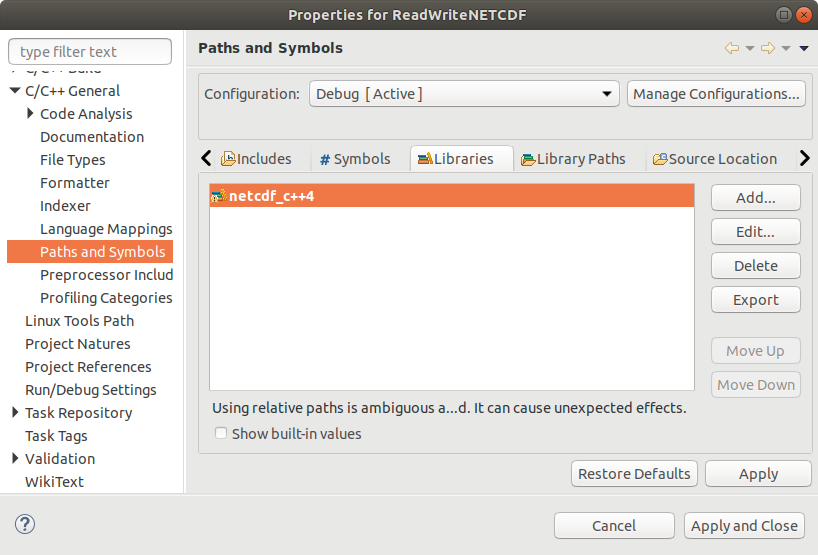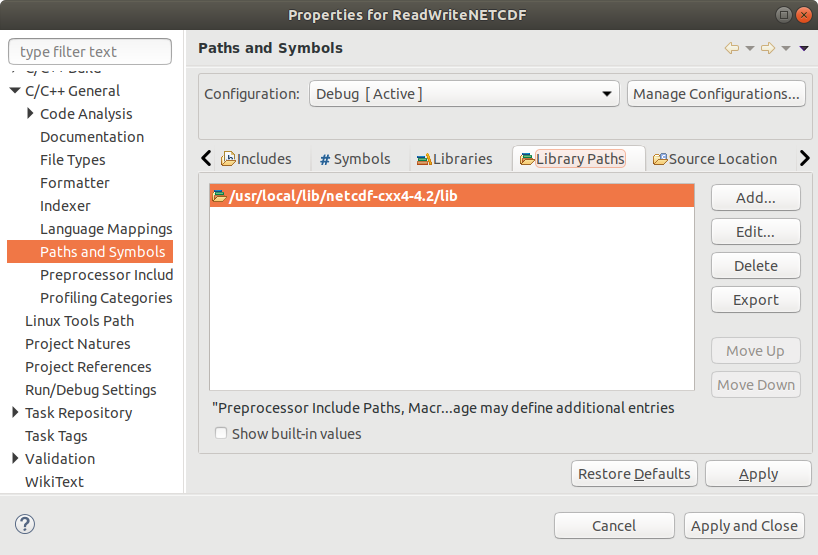 C++ library in eclipse. After the following steps:(1) download NetCDF-4 C++ 4.3.0 from https://www.unidata.ucar.edu/downloads/netcdf/index.jsp