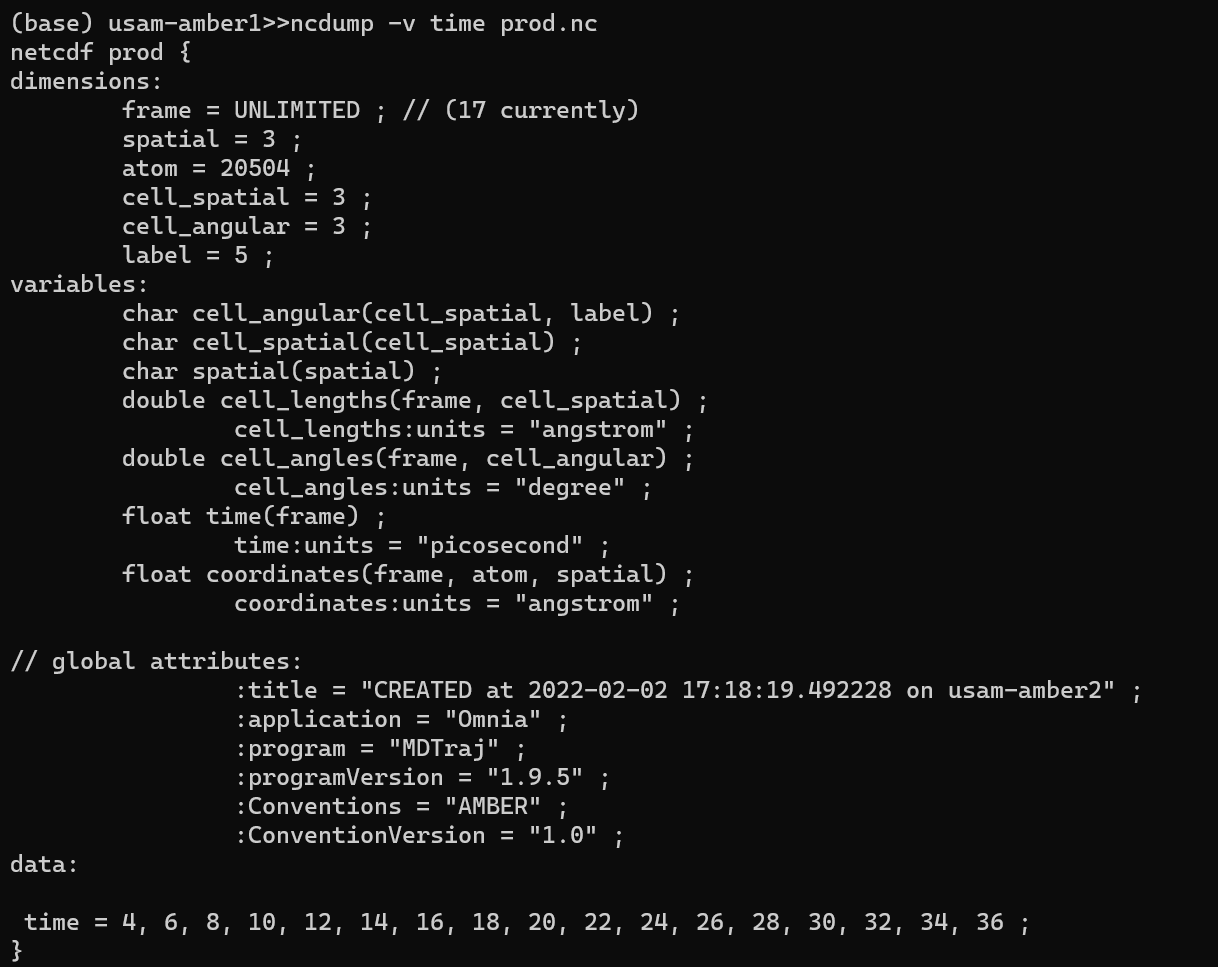 Hi Gus Thank you for looking into this. The time variable is supposed to contain floating-point numbers as in the attached screenshot. I did try converting the file to a cdl format following some earlier threads in the mailing list. The resulting cdl file does not contain any data. I am trying to figure out where the data is getting stored. As I pointed out in my initial post, the size of the netcdf file increases with the number of frames stored during the simulation. Best Ram On Fri, Feb 4, 2022 at 11:35 AM Gus Correa <gus@xxxxxxxxxxxxxxxxx> wrote: > Hi Ramakrishnan > > Do you know what is stored in the "time" variable, if anything? > > ncdump -c prod.nc > > should tell (prints the header and the coordinate variables, including > time). > > A brute force method to fix a broken netCDF (if the file size is not > gigantic) > that I used in the past is this: > > First use ncdump to dume the whole file to a text file, > say ncdump prod.nc > prod.cdl > cdl is the "common data language:", a text representation of a netCDF file. > > Then, second, edit/doctor the prod.cdl text file (with vi, emacs, etc). > Replace the time dimension 0 by the correct value. > If the time coordinate variable is wrong, replace each of its entries by > the correct value. > Be very careful so as not to mess up the cdl syntax (there are commas > separating values, > and other symbols separating variables, etc). > Save the edited prod.cdl file, possibly with a different name, say > prod_new.cdl > > Finally use ncgen to regenerate the prod.nc file from the edited cdl: > ncgen -b -o prod_new.nc prod_new.cdl > This will create the prod_new.nc file, presumably with everything fixed > (assuming the original file had > the correct data, except for the time dimension and time coordinate > variable perhaps). > I am citing from memory here, so please double check the ncgen man page > before you try. > For details on the ncgen syntax, see: > https://linux.die.net/man/1/ncgen > > I used this primitive method to fix a few damaged netCDF files in the past, > in desperate situations like yours. > I am not proud of its elegance, > but sometimes elegance is what you care less about, > and it worked for me. > > Also, you may need to do "ncdump -k prod.nc" beforehand, > to check which type of netcdf format your file has. > Then use the same format in the ncgen command above. > > I hope it helps. > Gus Correa > > On Fri, Feb 4, 2022 at 9:52 AM Ramakrishnan N <ram.n.krishnan@xxxxxxxxx> > wrote: > >> I have a netcdf file (prod.nc) that contains time series from a >> molecular dynamics simulation (Amber force field, OpenMM engine, parmed >> netCDFReporter). The netCDFReporter had some problems and as a result, the >> number of frames in the netcdf file is zero. Given below is the ncdump for >> the file: >> >> >> >> >> >> >> >> >> >> >> >> >> >> >> >> >> >> >> >> >> >> *$ncdump -h prod.nc <http://prod.nc>netcdf prod {dimensions: frame >> = UNLIMITED ; // (0 currently) spatial = 3 ; atom = 20504 >> ;variables: char spatial(spatial) ; float time(frame) ; >> time:units = "picosecond" ; float coordinates(frame, atom, >> spatial) ; coordinates:units = "angstrom" ;// global >> attributes: :Conventions = "AMBER" ; >> :ConventionVersion = "1.0" ; :application = "AmberTools" ; >> :program = "ParmEd" ; :programVersion = >> "3.4.0+11.g1be8ca0f" ; :title = "ParmEd-created trajectory" >> ;}* >> >> However, the netcdf file has non-zero size (that increases linearly with >> the number of frames stored) which implies that it certainly has the data >> written into it. I tried a number of tools (nco tools, netCDF4, scipy >> netcdf reader, xarray) to access the missing data but have not succeeded. >> >> >> >> >> >> *I have two questions:1. Does the file contain real data?2. If the >> former, is there a way to retrieve the data and create a new netcdf file?* >> >> I am desperately looking to salvage near 3 microseconds of simulation >> data which would take more than 2 months to generate. I would greatly >> appreciate it if anyone can provide me with some insight into this problem. >> >> The attached netcdf file has 14 frames that can be used to examine the >> issue. >> >> Thanks in advance >> >> Best >> Ram >> >> >> _______________________________________________ >> NOTE: All exchanges posted to Unidata maintained email lists are >> recorded in the Unidata inquiry tracking system and made publicly >> available through the web. Users who post to any of the lists we >> maintain are reminded to remove any personal information that they >> do not want to be made public. >> >> >> netcdfgroup mailing list >> netcdfgroup@xxxxxxxxxxxxxxxx >> For list information or to unsubscribe, visit: >> https://www.unidata.ucar.edu/mailing_lists/ >> >