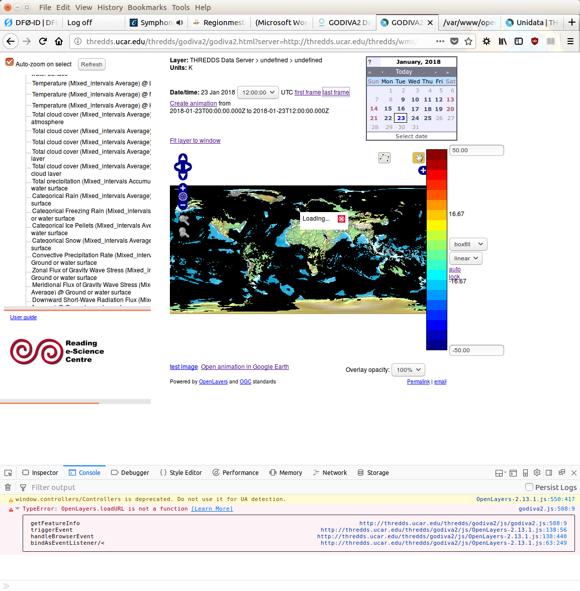 Hi, we recently upgraded to thredds 4.6.11 and all GetFeatureInfo requests are no longer working. I tested thredds.ucar.edu, and that server has the same problem (see screenshot): TypeError: OpenLayers.loadURL is not a function Checking the OpenLayers documentation, it seems that they deprecated OpenLayers.loadURL: http://dev.openlayers.org/apidocs/files/deprecated-js.html#OpenLayers.Ajax.OpenLayers.loadURL A quickfix could be to load the Openlayers 'deprecated.js' in thredds. Best regards, Heiko Klein -- Dr. Heiko Klein Norwegian Meteorological Institute Tel. + 47 22 96 32 58 P.O. Box 43 Blindern http://www.met.no 0313 Oslo NORWAY